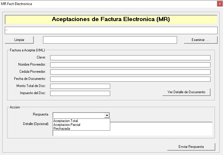 En esta pantalla se realiza la aceptación de la factura electrónica donde el procedimiento es primero descargar el archivo de XML del correo electrónico luego en el botón Examinar lo busco y lo abro y el sistema lo pasa a esta pantalla con toda la información. En el botón que se encuentra a la derecha de la pantalla que dice Ver Detalle de Documento muestra toda la información de la factura para revisarla y estar seguro que el documento este bien. En la parte de abajo en la opción Respuesta tiene tres opciones en la flecha: Aceptación Total en la que se acepta toda la factura, Aceptación Parcial en la que solo se acepta una parte y Rechazada en la que del todo no se acepta la factura, una vez elegida la opción le da click a el botón Enviar Respuesta y ya el sistema le manda dos mensajes de forma continua donde se informa que se concluye el proceso y le damos Aceptar.