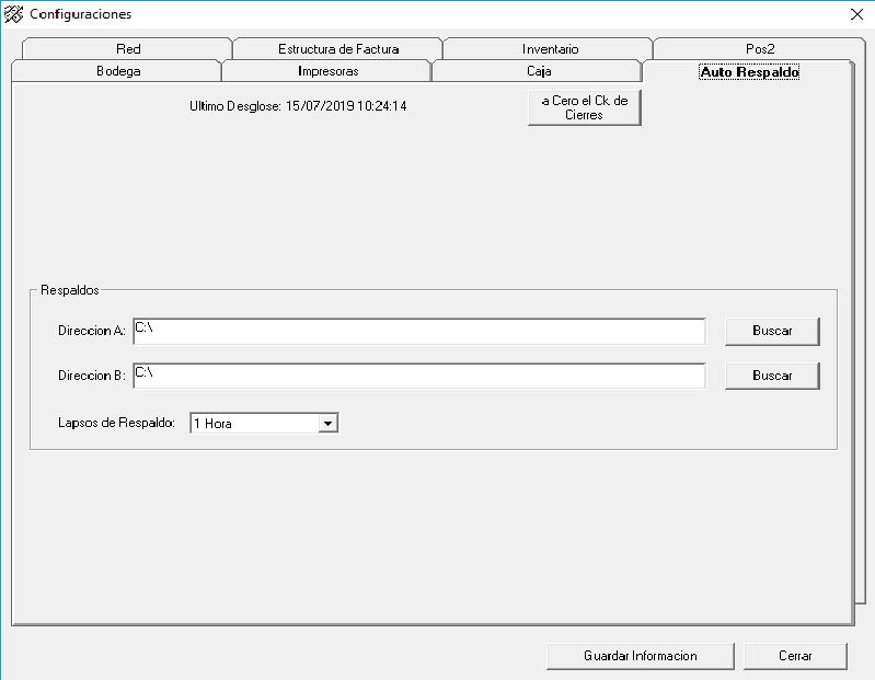 En esta pantalla en la pestaña Auto Respaldos se va a la opción Buscar en ella le da a una ventana y luego a una carpeta donde esa es la que se elige para completar la dirección en las dos opciones en la Dirección A y Dirección B ya luego el sistema automáticamente estará haciendo respaldos por diferentes lapsos de tiempo que quedaran establecidos de acuerdo a gusto del cliente. Al finalizar le da click al botón Guardar Información que abre un mensaje que le da Aceptar y luego Cerrar.