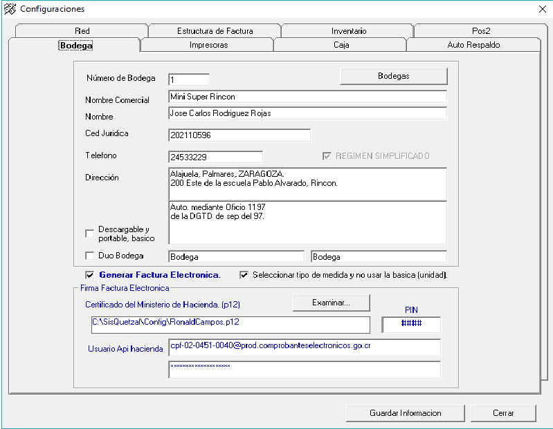 En esta pantalla en la pestaña Bodega es donde empezaremos a llenar toda la información que se pide y se detalla rubro por rubro hasta que ya quede toda completa, al llegar donde dice Firma Factura Electrónica en la parte derecha en el botón Examinar da un click para terminar de completar los espacios restantes una vez finalizado da click al botón Guardar Información donde aparece un mensaje que le da Aceptar y luego Cerrar para que quede establecida la información.