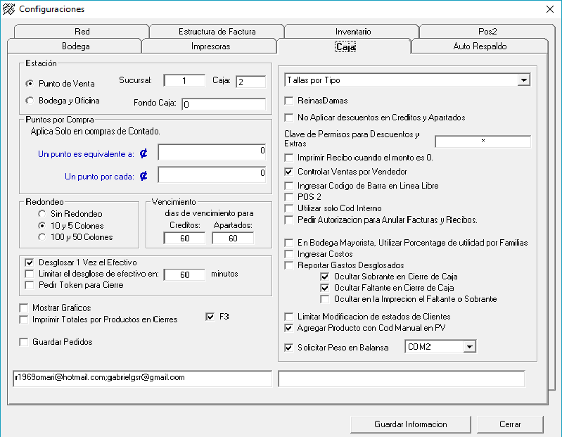 En esta pantalla en la pestaña Caja se configura todo lo correspondiente a la caja, muy detalladamente se llenan las opciones que se presentan de acuerdo a la necesidad y la decisión del cliente. Al finalizar se da click al botón Guardar Información que abre un mensaje que le da Aceptar y luego Cerrar.
