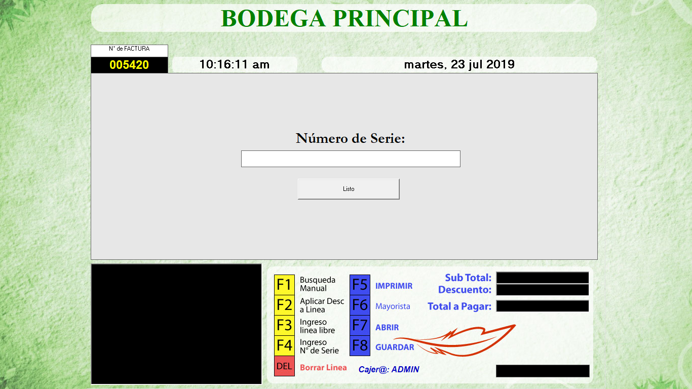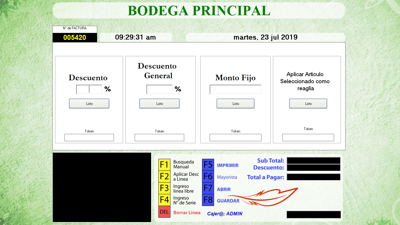 4.Si por alguna razón se solicita un descuento ya con el articulo facturado, simplemente presiona la tecla F2 en ella muestra una pantalla donde se especifica el tipo de descuento ejemplo: en Descuento y Descuento General se escribe la cantidad de descuento pide la autorización de Token y la tecla Listo la diferencia es que en descuento si tiene varios productos en la factura solo se le aplica a uno, en el descuento general lo aplica a todos los artículos de la factura, en el Monto Fijo se escribe ya el precio con el que queda el articulo igual pide el token y tecla Listo.Y por ultimo Aplicar Articulo Seleccionado como Regalia donde su palabra lo dice es regalia y se piden token y tecla Listo. Para pedir un Token o autorización simplemente funciona así si usted es administrador solo digita su clave en el espacio token pero si es un usuario normal tendrá que llamar a la persona encargada para pedirlo y especificar que tipo de descuento necesita y el número de factura para que le den un número que usted ingresara en dicha casilla.