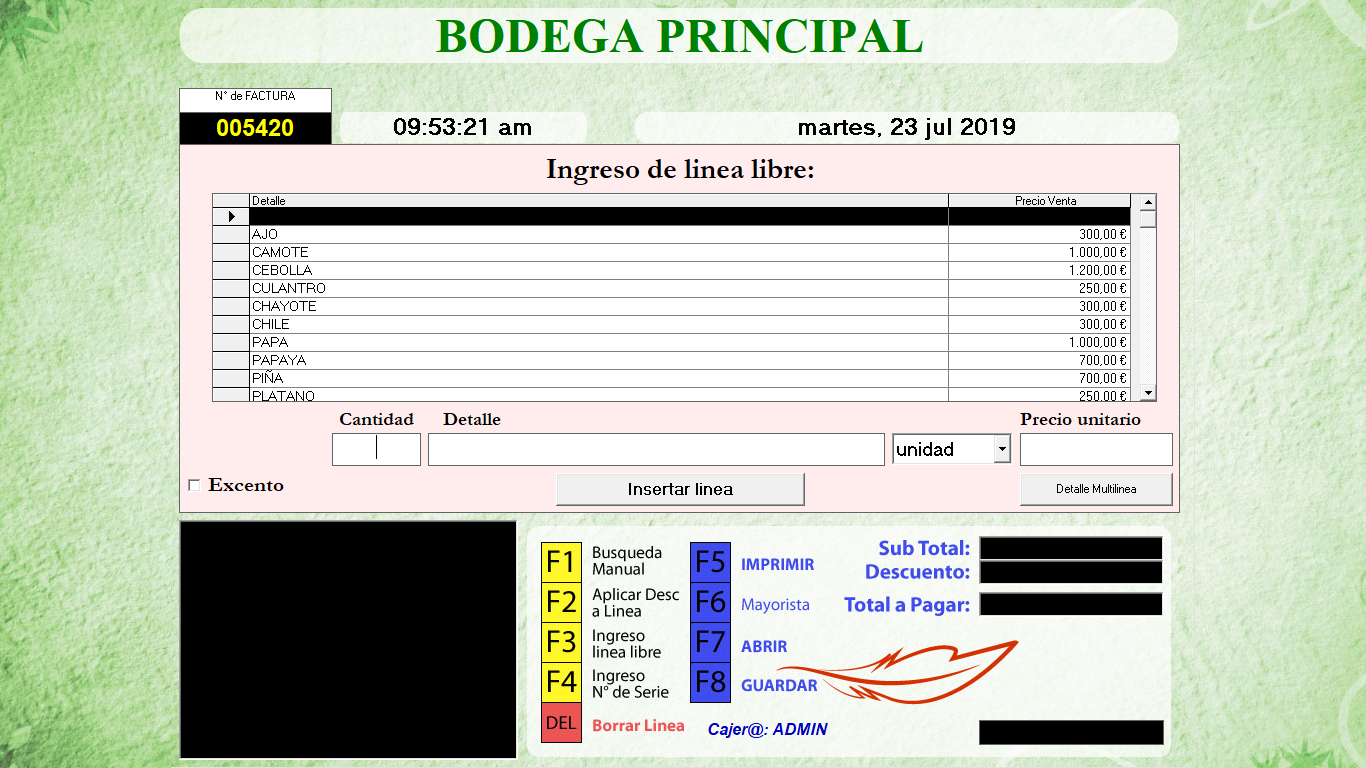 5.En algunos casos puede suceder que el articulo que se necesita vender no esta ingresado entonces el sistema facilita la tecla de F3 que es Linea Libre ella funciona de la siguiente manera: se presiona la tecla y nos abre una pantalla donde en la casilla Cantidad se escribe cuantas unidades,en la casilla Detalle que tipo de producto es ,el código y que no tiene existencia en el sistema,en la casilla de la par se selecciona en la flecha dependiendo del tipo de servicio que presta si es para venta de un producto ejemplo es unidad y el la casilla Precio unitario se escribe el monto del producto.Para finalizar dar click en la casilla Insertar Linea y ya queda el articulo en la pantalla de facturación.