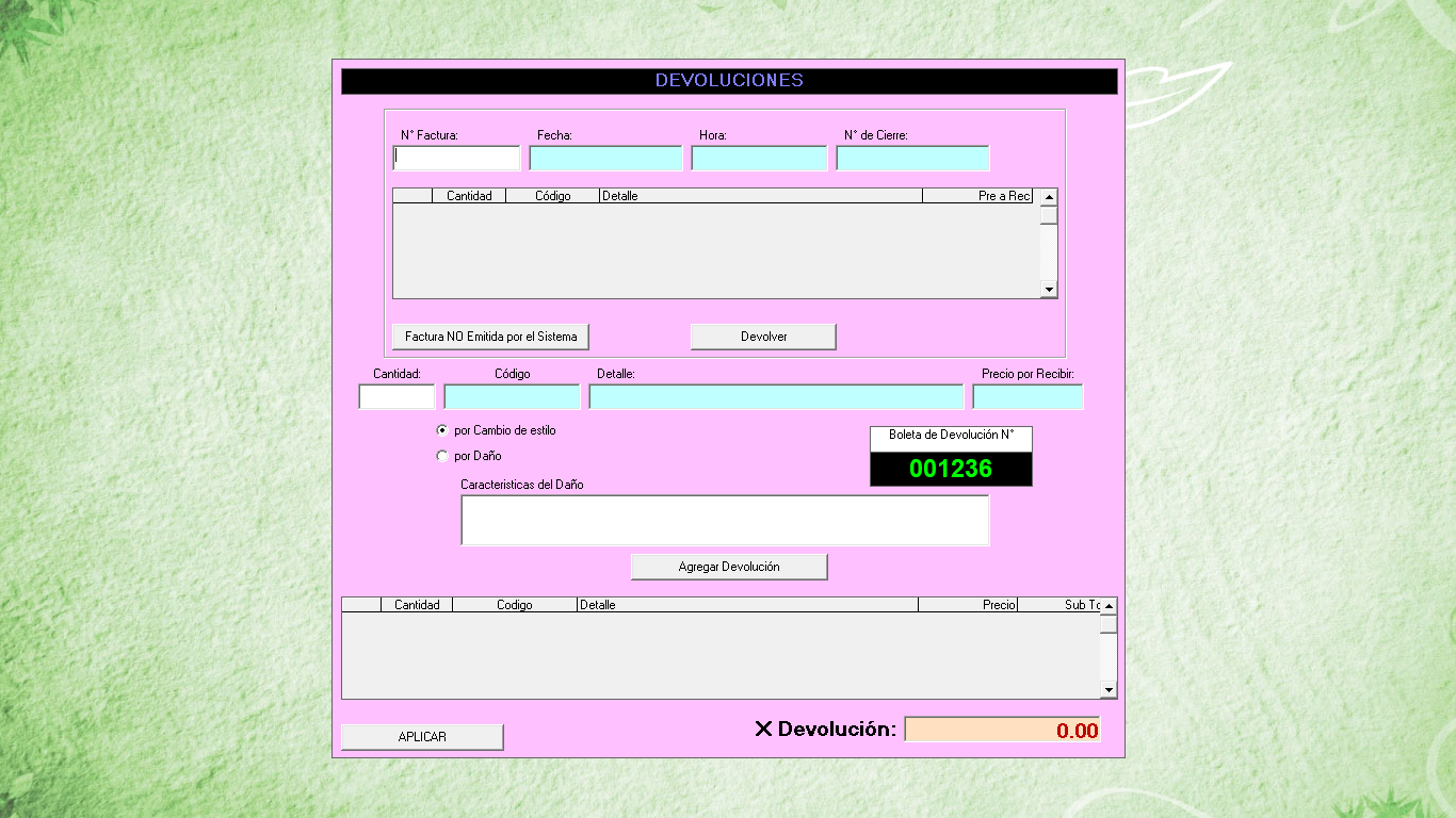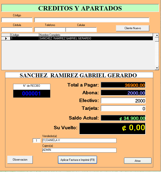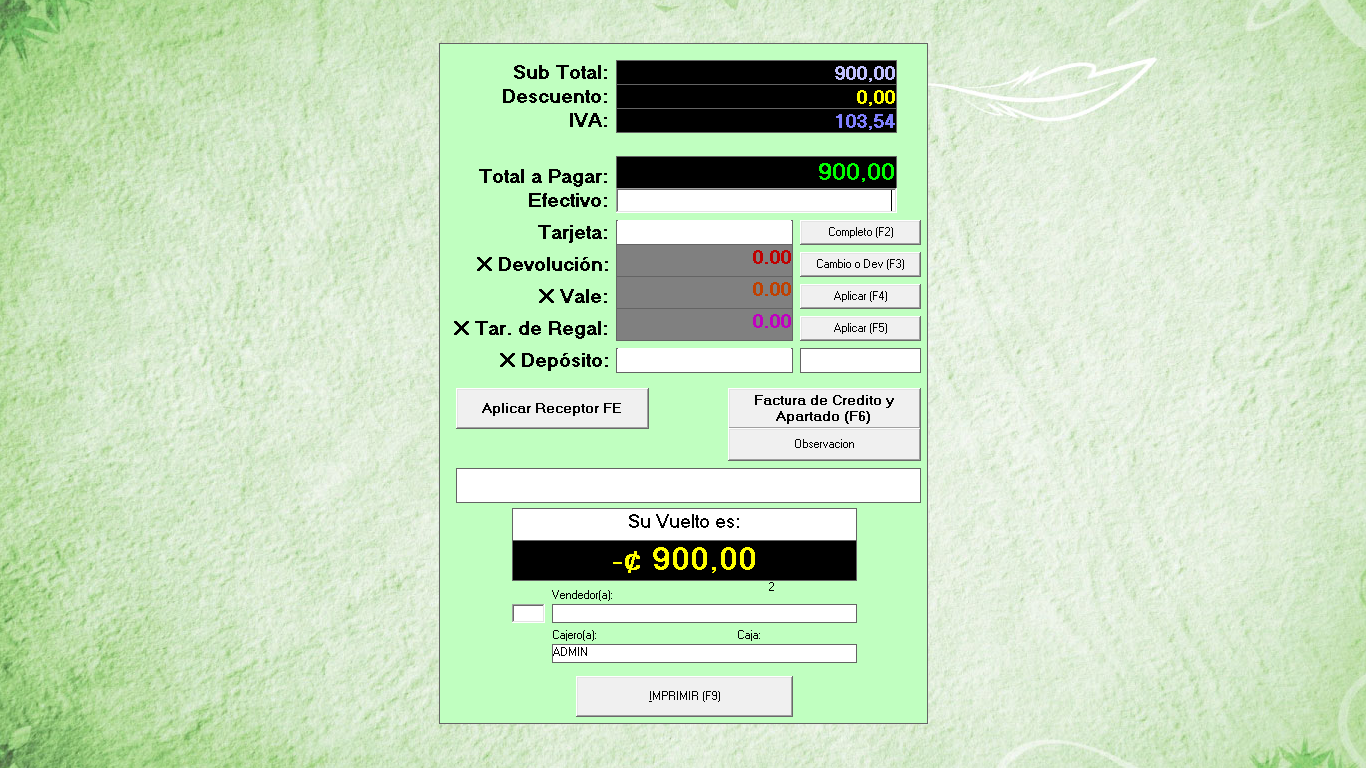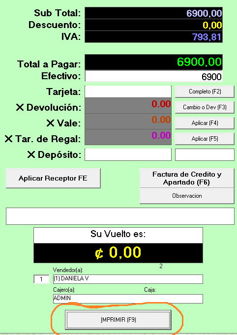7.En la tecla de F5 ya podemos imprimir la factura del cliente al presionarla pero esta pantalla esta estructurada de la siguiente manera: el sub total donde automáticamente le da el monto, el descuento y el IVA por casillas separadas, total a pagar Efectivo aquí se digita la cantidad de dinero que nos dan o en tarjeta donde la tecla de completo es para digitar el monto, en la casilla X devolución damos click a la opción de la par de Cambio o Dev (F3) esta nos genera una pantalla donde podemos ingresar todos los datos para hacerla valida. La siguiente casilla X vale en la opción de la par Aplicar (F4) aquí también abre una pantalla donde nos pide una información que se llena para poder generarlo.La casilla de X Tar. de Regalo igual da click a la opción de Aplicar (F5) nos abre una pantalla para llenarla con la información necesaria y poder aplicarla .En la opción X deposito solo se llenan las casillas con la información del deposito si tiene sino se dejan en blanco.Casi al final nos encontramos dos casillas opcionales de usar si la persona lo solicita, Aplicar Receptor FE que es utilizado para ponerle un nombre al ticket de la factura se da click a la opción y nos da una pantalla donde se ingresa la información del cliente, como número de cédula, nombre completo y si gusta el correo electrónico y la otra Factura de Crédito y Apartado donde se da click para ingresar y aquí se ingresa el código de cliente si existe o si es por primera vez se va a la opción Cliente nuevo e ingresa todos los datos,una vez con el cliente creado o agregado y todos los datos verificados da click a Seleccionar , luego en las casillas de saldo de crédito o saldo de apartado, aquí se especifica cual de los dos es o le da click a la casilla que dice Apartado si es apartado si es crédito se va directamente a la casilla de Monto Abonar donde digita el monto a pagar.Ya una vez completada toda la información necesaria se le abre otra pantalla donde se digita de nuevo el monto a pagar si es en efectivo o tarjeta y por ultimo el numero de vendedor y la casilla Imprimir o F9 y listo.