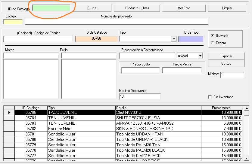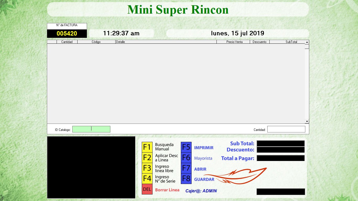 3. Se abre la pantalla para facturar en la que existen varias formas para facturar como por ejemplo, con el lector se posiciona en código de barras y automáticamente aparece el articulo,con la tecla de F1 donde podrá buscar articulo por código o por estilo, una vez que lo encuentre da un enter y ya pasa a la otra pantalla.O simplemente en la pantalla de facturación en el ID de Catalogo dígita el código , la cantidad y da enter.