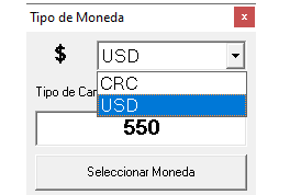 10.Tecla F11 aunque esta no se encuentre en las teclas del sistema a la hora de facturar, su función es poder cambiar el tipo de moneda ya sea dólares que se representa con las siglas USD o colones con siglas CRC.Se escribe el tipo de cambio para cuando es dólares se selecciona con la flecha y un click a Seleccionar Moneda y el sistema hace el cambio.