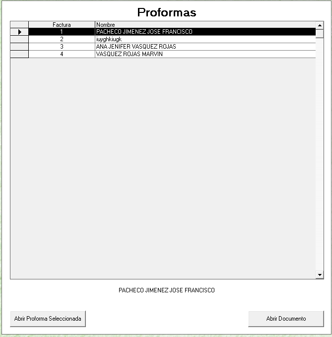 8.En la tecla de F7 Abrir, la función es abrir las proformas que se encuentran guardadas en el sistema en la cual tenemos dos casillas, la de Abrir Proforma Seleccionada esta lo que realiza es pasarla a la pantalla de facturación con solo darle un click a la proforma que necesita, y en la otra opción Abrir Documento nada mas digita el número de documento y también esta la pasa a la pantalla de facturación, una vez aplicada esta se borra automáticamente de la lista.