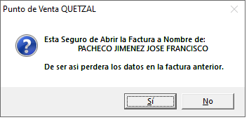 Esta mini pantalla es la que muestra al darle click a Abrir Proforma Seleccionada. Solo da un click a SI para que se pase a la pantalla de facturación.