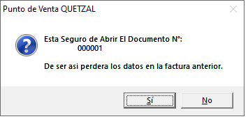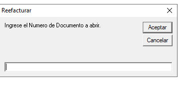 Esta mini pantalla es la que muestra al darle click a Abrir Documento , en ella se escribe el número de documento que necesitamos y click a Aceptar, luego abre otra ventana donde estando seguros del documento se le da un click a la opción SI para que se pueda facturar.