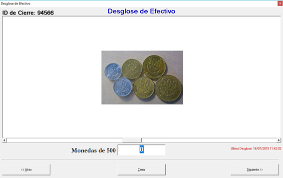 3.Muestra una serie de pantallas donde se empieza a desglosar todos los billetes desde el mayor valor hasta el de menor valor y terminando con las monedas en el mismo orden.