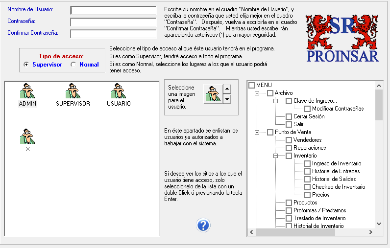 En esta pantalla se crean los diferentes usuarios que va a tener el sistema dependiendo de la necesidad de cada cliente. Se escribe el nombre del usuario, la contraseña a elegir y luego la confirmación de la misma. En ella se puede elegir dos tipos de acceso el primero como Supervisor al elegir este, la persona tiene acceso a utilizar todas las funciones del programa menos a la configuración. El segundo acceso que es el Normal se le selecciona los lugares a los q va tener acceso en el cuadro del lado derecho, el usuario de alguna manera queda más restringido. También puede elegir una imagen para el usuario, y si desea ver los sitios a los que tiene acceso, solo selecciónelo de la lista con doble click o presionando la tecla enter.