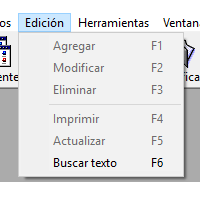 En la pestaña de Edición se puede ver una serie de teclas para facilitar el trabajo como por ejemplo F1 Agregar, F2 Modificar, F3 Eliminar, F4 imprimir, F5 Actualizar y F6 buscar texto.