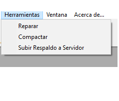 En esta pestaña Herramientas se dan 3 opciones la primera que es Reparar ayuda agilizar la información del servidor cuando está un poco lento, la segunda Compactar sirve para actualizar la información y la tercera Subir Respaldo a Servidor es para cuando el icono de una R que se localiza casi siempre en la parte inferior de la computadora al lado derecho por el reloj, se desaparece ella la vuelve a incorporar al sistema.