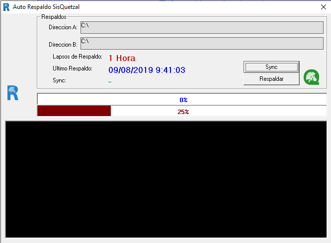 Esta pantalla que se visualiza es la de Respaldo o R que se abre al dar doble click en ella, y muestra dos opciones de uso una que sirve para que la información se pueda sincronizar y vaya fluyendo correctamente en la casilla Sync con solo dar un click se empezaran a llenar las dos barras de abajo al 100% y la otra es la casilla de Respaldar que se utiliza por si se quiere hacer el respaldo del sistema manualmente con un click ,las barras también empezaran a llenarse hasta completar al 100% y saber que el proceso esta concluido.Es importante mencionar que el respaldo de la información del sistema ya quedo establecido en un lapso de tiempo que se selecciono en Configuraciones/AutoRespaldo.