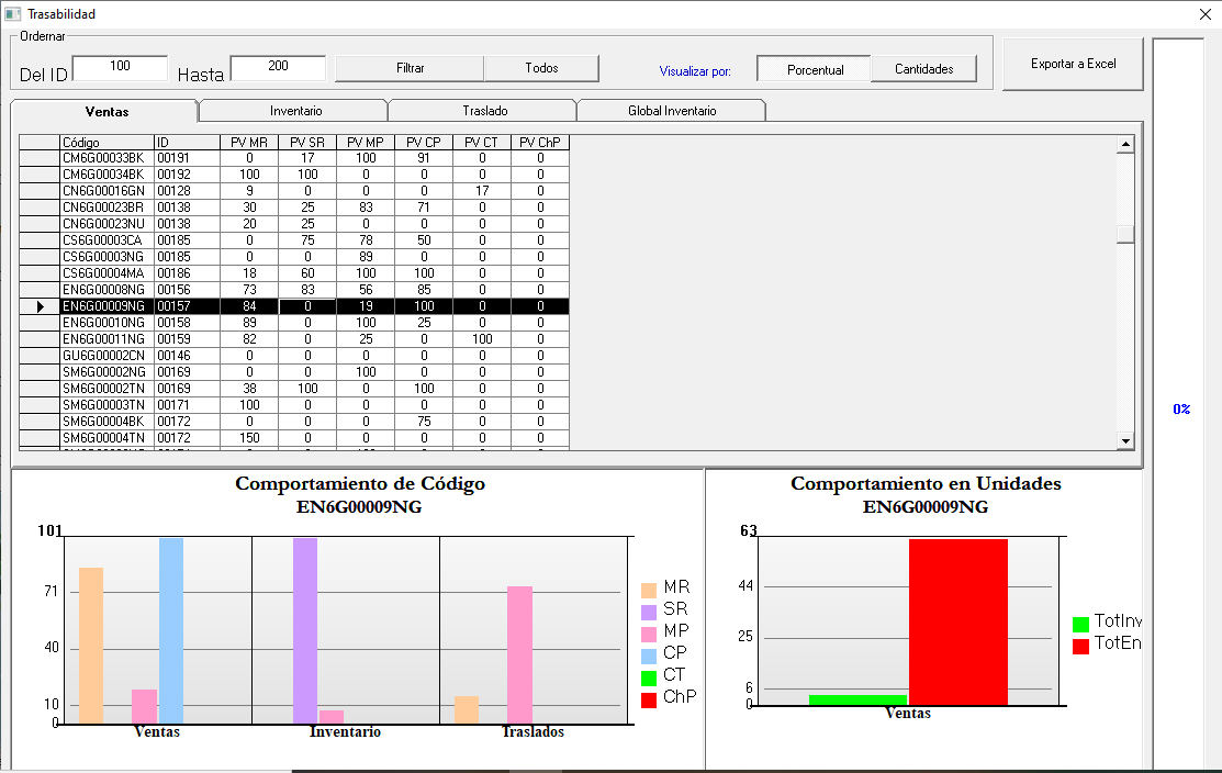 De la pantalla anterior en el botón Trazabilidad nos muestra esta pantalla, la cual funciona eligiendo en la casilla Del ID - Hasta los códigos que quiere visualizar, si es por código o la otra opción si quiere ver todos en el botón Todos. También podemos verlos en dos opciones Porcentual y Cantidades nada más da click en la que prefiere. Aquí podemos elegir qué es lo que vamos a ver en las pestañas de abajo ya sea Ventas, Inventario, Traslados o Global inventario, una vez seleccionada la pestaña nos vamos y damos click al botón Filtrar esa información pasará a la pantalla en blanco del medio de la imagen y en la parte de abajo lo muestra en gráficos por comportamiento de código o por comportamiento de unidades. Para una mayor visualización en el botón Exportar a Excel da un click y al lado derecho hay una barra que se empezara a llenar hasta completar al 100% y una vez listo podemos ver la información muy detallada en un archivo de Excel.