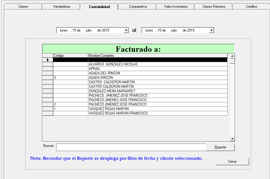 Esta pantalla es la que se abre al dar click al Reporte por Clientes, aquí se selecciona las fechas y manda la información a la pantalla Facturado a: donde genera todos los clientes que fueron facturados en la fecha que se selecciono al principio, de ahí en la opción buscar escribo el nombre del cliente que se quiere ver y en el botón Reporte genera un reporte del cliente seleccionado y toda la información del mismo.