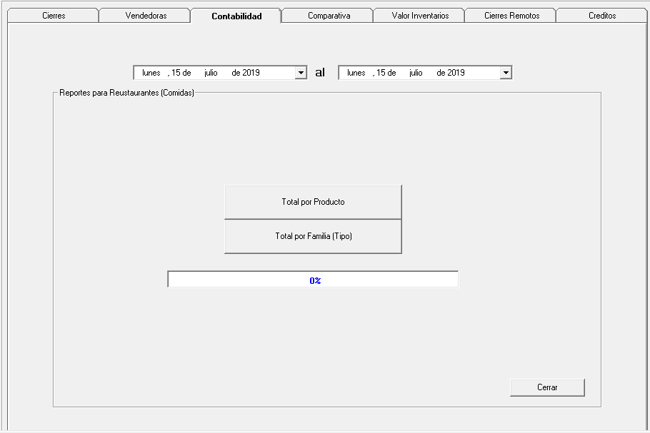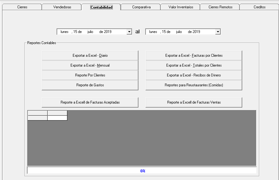 En esta pantalla en la pestaña Contabilidad se pueden generar diferentes reportes para el uso de la contabilidad en un simple paso de seleccionar las fechas que se quieren analizar y dar click al reporte que se necesita por lo general lo que hace es abrir una hoja de excel donde se encuentra la información.