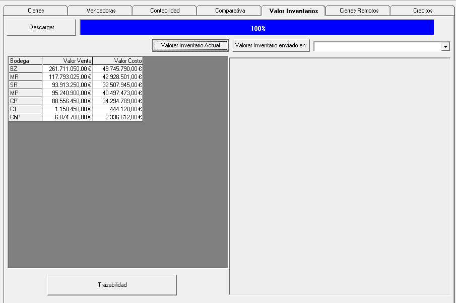 En esta pantalla en la pestaña Valor Inventario se puede obtener la información del inventario empezando en el botón Descargar le da un click y espera que la barra azul se complete al 100%, luego tenemos dos opciones: Valor Inventario Actual al dar click aquí se muestra total del valor del inventario por valor de venta o por valor de costo y en la opción Valor Inventario enviado en: aquí es la misma función pero por mes seleccionado en la flecha y solo muestra un monto.