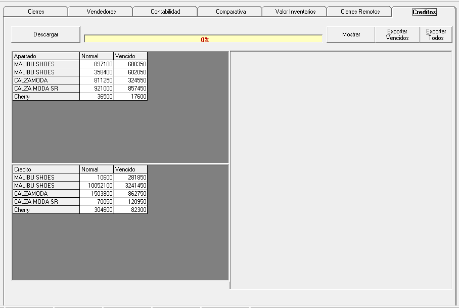 En esta pantalla en la pestaña Créditos, primero en el botón Descargar le da un click espero que se complete la barra al 100%, luego el botón Mostrar se visualiza la parte de Apartados y Créditos mostrando el monto que se encuentra normal y el que esta vencido. También nos da dos botones a la par de el de mostrar que son Exportar Vencidos que la función es crear un archivo de Excel donde muestra todo lo vencido créditos o apartados. Y Exportar Todos que es la misma función del anterior pero incluye toda la información de créditos y apartados.