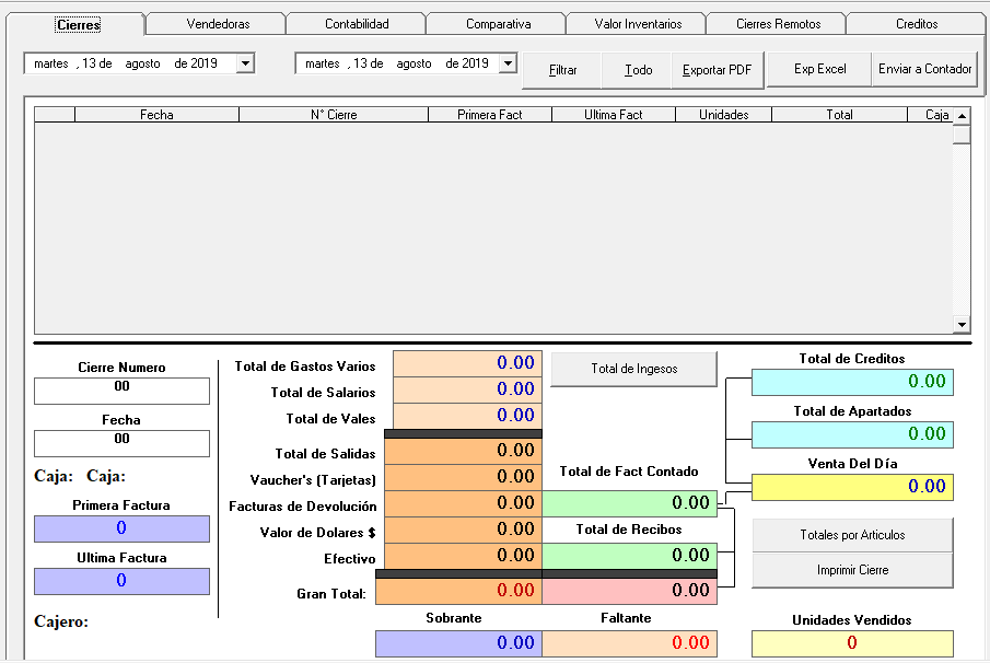 En esta pantalla en la pestaña Cierres, se puede seleccionar de qué fecha a que fecha desea ver , en las opciones con flechas solo la selecciona en el calendario que muestra, luego en botón Filtrar da un click para que se ordene por fecha de ahí puede obtener el monto total por mes o por fecha seleccionada en el botón de abajo Total de Ingresos .En los otros botones de arriba como por ejemplo en el botón Todo es para mostrar todos los cierres, en el botón Exportar PDF, Exp Excel, y Enviar a Contador su palabra lo dice es para la función que necesite el usuario y el genera el archivo correspondiente. Y en la parte inferior al lado derecho se nos muestra otras dos funciones en botones que sería Totales por Artículo que muestra el total de artículos e Imprimir Cierre el cual si por alguna razón necesita imprimirlo lo hace desde acá.