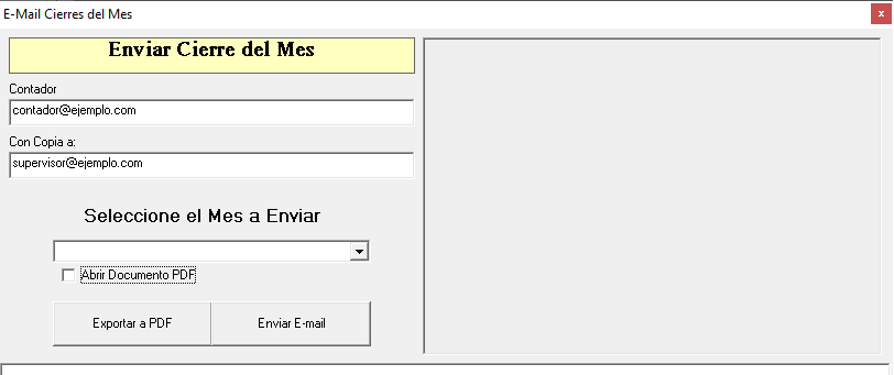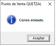 Al dar click a la casilla Enviar a Contador muestra esta pantalla que es la que se utiliza para mandar la información de los reportes de ventas en documentos de PDF por mes y por sucursal al contador por correo electrónico. La manera de enviarlos es escribiendo el correo electrónico del contador luego si lo ocupa con una copia para el dueño o supervisor y da un click a la casilla Enviar E-mail y así el sistema da un mensaje de correo enviado al que le da un click Aceptar.