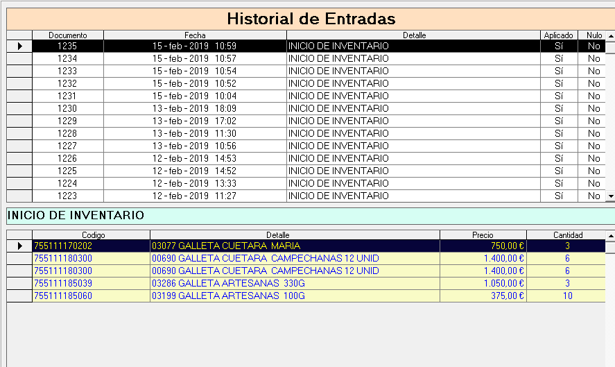 En esta pantalla se indica todas las entradas detalladas que se han realizado a lo largo del tiempo en el establecimiento. En ella se puede ver el número de documento, la fecha, la razón por la que entro y la cantidad por producto o código para mayor facilidad.