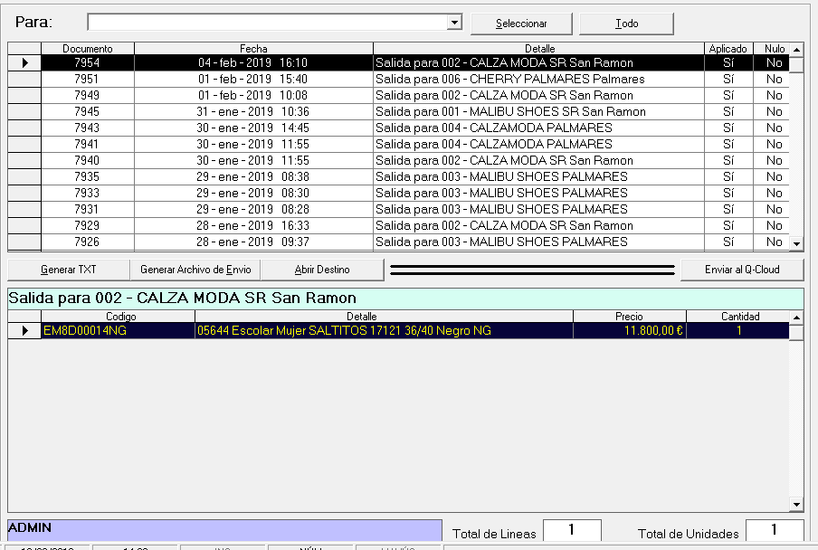 En esta pantalla se indica todas las salidas detalladas que se han realizado a lo largo del tiempo en el establecimiento. En ella se puede ver el número de documento, la fecha, la razón por la que salio y la cantidad por producto o código para mayor facilidad. También si por alguna razón ya se mando la información a la sucursal y esta no les llego la puedo volver a enviar con solo buscar el número de documento y dar click a la casilla Enviar al Q-Cloud esperar que se llene la barra de porcentaje y listo.