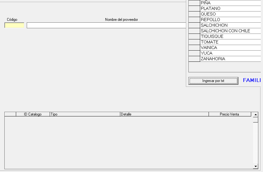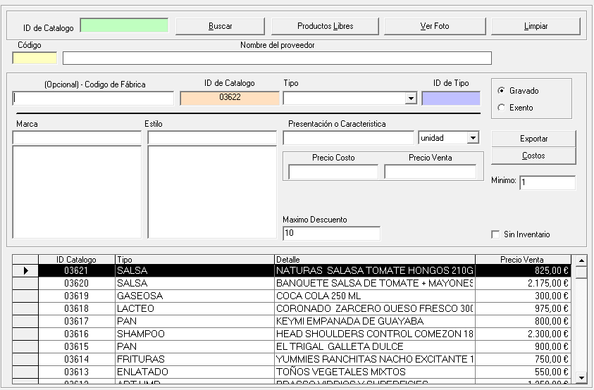 En esta pantalla es donde se hace la creación de códigos para cada producto, en el Código la casilla amarilla podrá dar doble click para agregar el Nombre del proveedor, luego el sistema automáticamente genera un número de forma consecutiva en ID de Catalogo, en la casilla tipo se elige el que le corresponde, luego tiene dos opciones Gravado o Exento dependiendo del producto. Ya después se escribe la Marca, el Estilo, la Presentación o Característica, la casilla Unidad o dependiendo del articulo se selecciona con la flecha el que le corresponde, se completa el Precio de Costo y Precio de Venta el descuento permitido por el propietario que va en Máximo Descuento y Mínimo al finalizar se le da en la tecla F1 para agregar al catálogo, donde se genera un mensaje donde se informa el código que le corresponde al producto y le da Aceptar para seguir agregando artículos.