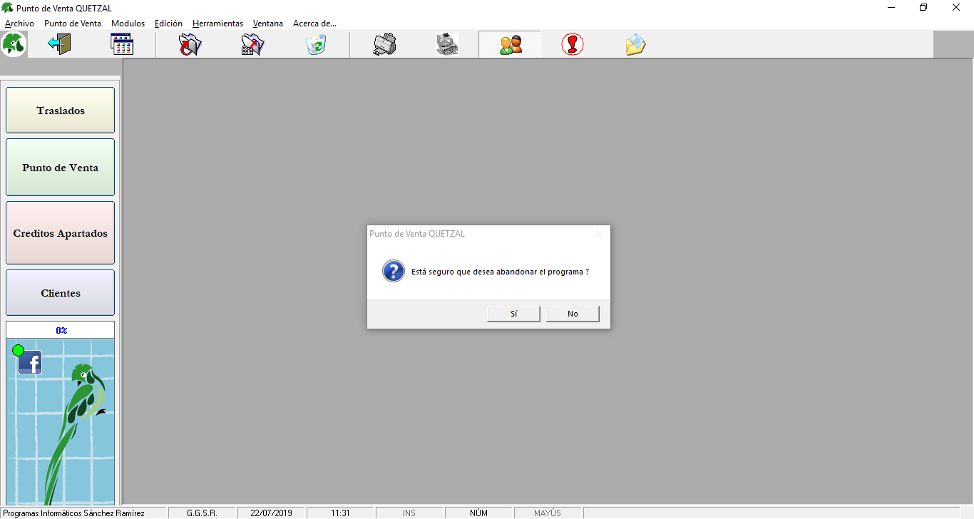 Esta es la pantalla principal donde si deseamos salir del sistema lo único que hacemos es dar click a la X que esta al lado derecho arriba y luego nos muestra una pantalla donde da click al SI y listo.