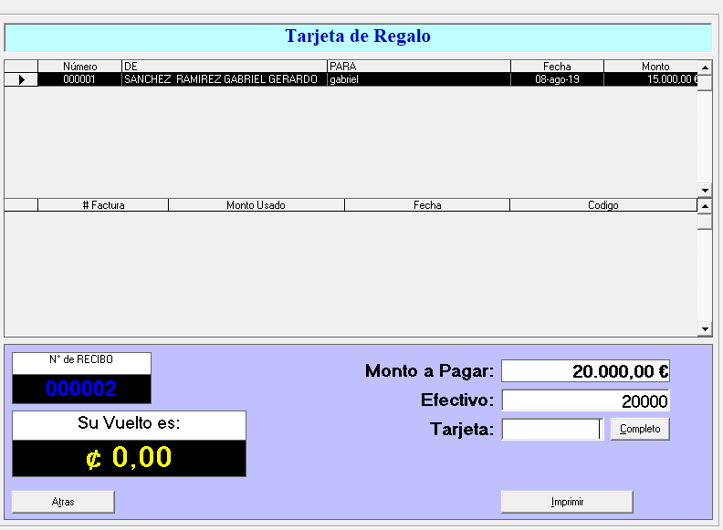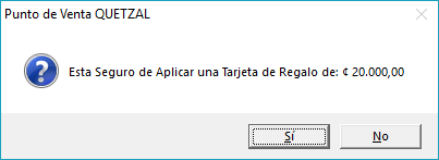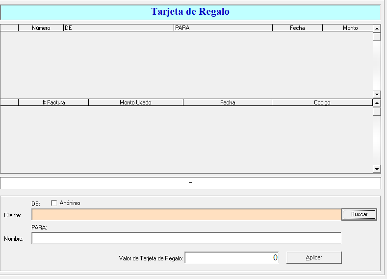 Esta pantalla muestra cómo realizar una tarjeta de regalo en la que consiste en llenar la casilla que dice De: Cliente escribe el nombre o en el botón Buscar se puede ingresar para agilizar el proceso y seleccionar el cliente . En la casilla Para: Nombre escribe el nombre para quien va ser dirigida la tarjeta que cuando se lleve a cabo el cambio podamos buscarlo y aplicarlo al sistema, en la casilla Valor Tarjeta de Regalo se le escribe el monto que la persona elige y por ultimo da click al botón Aplicar aquí se abre una pantalla en la que se especifica como va ser el pago si efectivo o tarjeta una vez completa la información le da click a Imprimir y de una vez le genera dos mensajes en los cuales da un click a la opción SI y se genera un comprobante que se le entrega a la persona para después poderlo hacerlo valido.