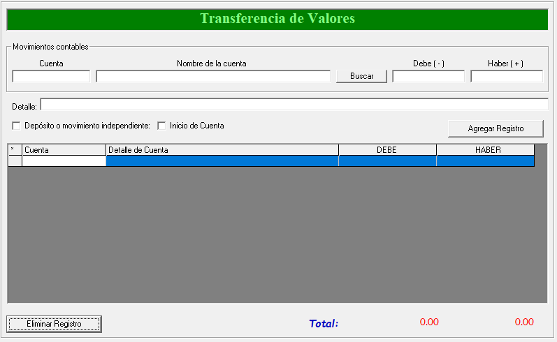 En esta pantalla es donde podemos hacer transferencias de una cuenta a otra o a varias .Desde aquí se selecciona primero una cuenta que es la que vamos a sacar el dinero en la casilla Debe escribe el monto, da un enter para que la información aparezca abajo luego selecciona de nuevo una cuenta y el monto que se va apagar en la casilla Haber aquí puede hacer varios pagos a diferentes cuentas o solo un pago eso depende del usuario, siempre y cuando el monto de la primera coincida con la o las de la segunda, cada vez que realice una da un enter para que se vea reflejado en la pantalla .Sencillamente siempre la cantidad del monto que se escribe en el Debe tiene que ser el mismo del Haber para que pueda cerrar y quede ya lista la transferencia igual la pantalla lo muestra en la opción que dice total en la parte de abajo ambos tienen que ser los mismos montos.