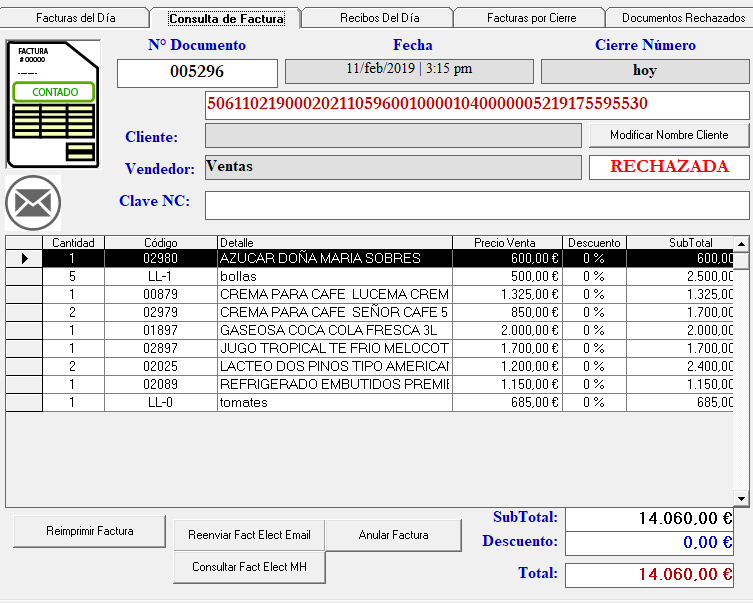 En esta pantalla en la pestaña Consulta de Factura se puede realizar la consulta de facturas de acuerdo al número de documento, también se puede cambiar el nombre en el botón Modificar Nombre Cliente. En ella se muestra toda la información de la compra, en la parte inferior se puede ir a los botones de Reimprimir Factura, Reenviar Fact Elect Email o Consultar Fact Elect MH estos con el fin de la necesidad que requiera el solicitante.Cabe mencionar que en esta pantalla se puede ver el estado de la factura si se esta procesando o enviando aquí debemos dar un tiempo hasta que la imagen con el sobre ponga un check en verde, o si es rechazada o aceptada.