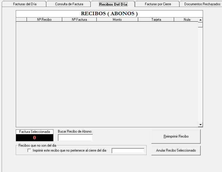 En esta pantalla en la pestaña Recibos del día se muestra todos los abonos realizados en el día, el cual lleva número de factura, monto y si fue en tarjeta .Además en la parte inferior en los botones Reimprimir Recibo o Anular Recibo Seleccionado permite realizar estas funciones si la necesita tan solo seleccionando el recibo o en el cuadro de Buscar digita el número de recibo.