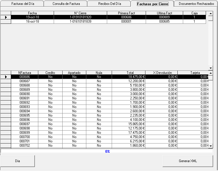 En esta pantalla en la pestaña Facturas por Cierre se puede ver cuál es la primera factura del día hasta la última de acuerdo al cierre, también se muestra si es crédito o apartado si es factura nula o por devolución puede observar detalladamente los montos de cada factura , si su pago fue en tarjeta. En los botones inferiores de Día y Generar XML se utilizan por si por alguna razón se tiene que buscar una información específica y enviar el archivo de XML.