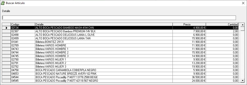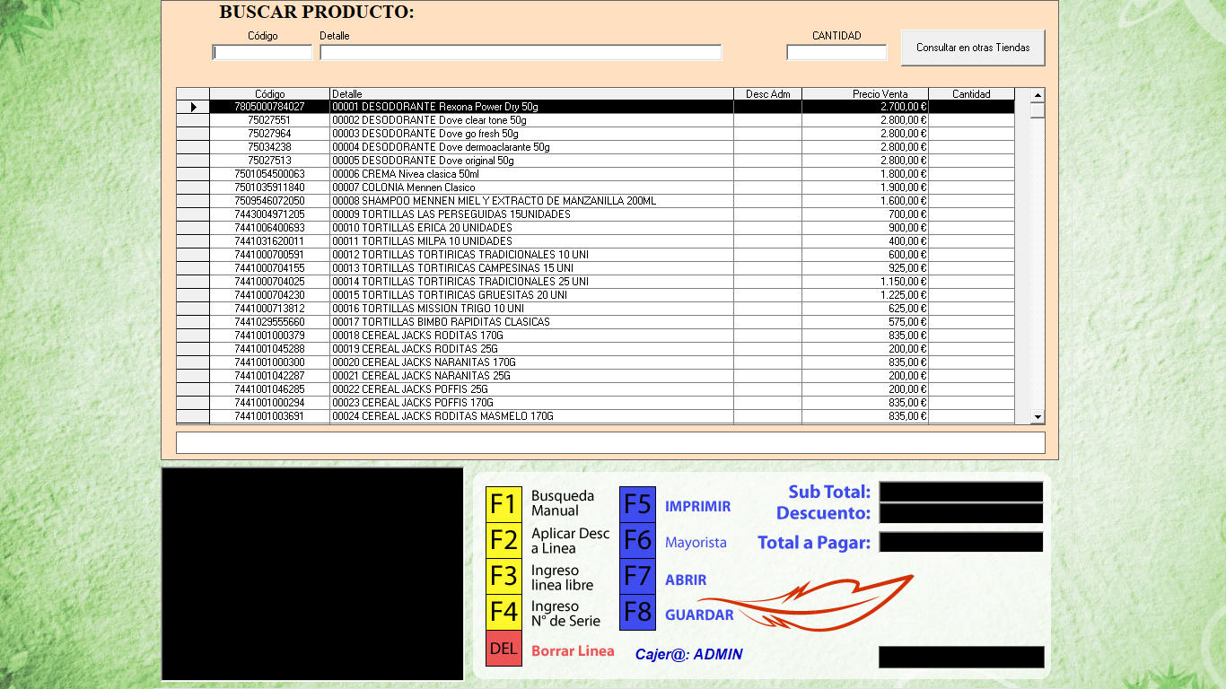 Esta es la imagen de buscar con la tecla de F1,en la casilla Código se puede buscar código de barras del producto o el que se le asigno por el sistema y en la casilla Detalle lo busca por la descripción del producto.Una vez que encuentre el articulo lo selecciona y en la casilla Cantidad puede escribir las unidades y da un enter para volver a la otra pantalla con la información seleccionada.