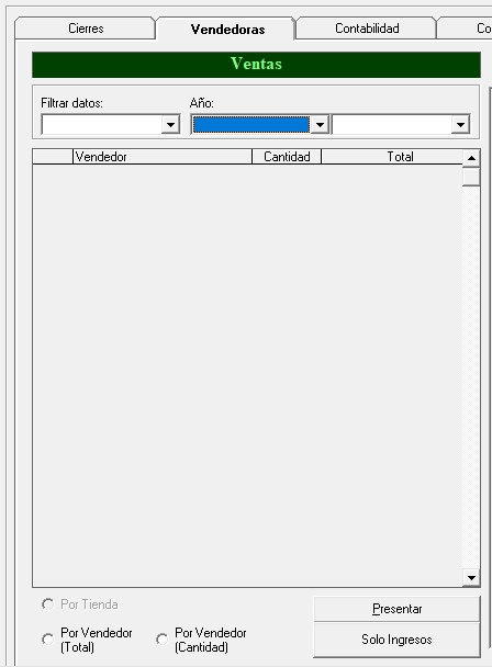 En esta pantalla en la pestaña Vendedoras se puede obtener la información del monto de ventas de manera anual, trimestral, mensual o semanal por vendedor en la pestaña Filtrar datos, luego selecciona la pestaña Año para ingresar el que quiere ver y en la otra pestaña sin nombre iría el mes cuando termina de completar la información automáticamente aparece en la pantalla desglosada por nombre de vendedor,cantidad de artículos vendidos y monto total. En la parte inferior también se muestra la misma información pero mas detallada puede seleccionar por Vendedor (total) o por Vendedor (cantidad) y dar click al botón Solo Ingresos para entrar a otra pantalla donde se desglosa si quiere ver las ventas de contado o por abonos de los vendedores que seleccione.